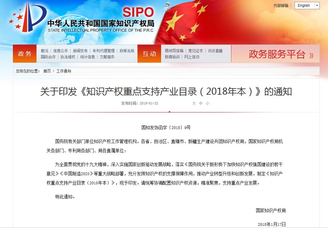 为全面贯彻落实党的十九大精神,深入实施创新驱动发展战略,认真落实《国务院关于新形势下加快知识产权强国建设的若干意见》决策部署,推动产业提升知识产权附加值,国家知识产权局在广泛征求部门、地方、相关研究机构、行业协会和专家学者意见建议的基础上,起草了《知识产权重点支持产业目录(2018年本)》(以下简称《目录》)。