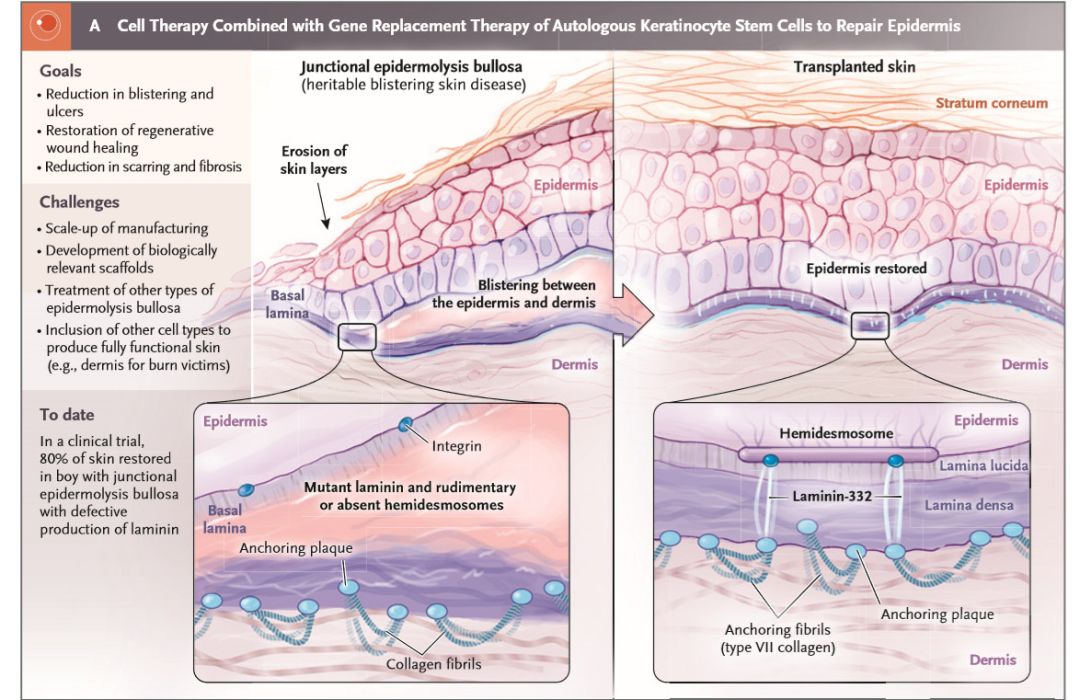 2017年时,著名学术期刊《Nature》就曾报道了一例利用转基因干细胞成功治疗一个年仅7岁的大疱性表皮松解症男孩的案例。男孩身上80%的皮肤都植入了经基因工程改造后的干细胞。