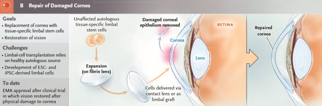 2015年,已有制备的可以修复因物理因素等造成角膜和视力损坏的成人组织特异性角膜缘干细胞获得欧洲药品管理局的上市许可。