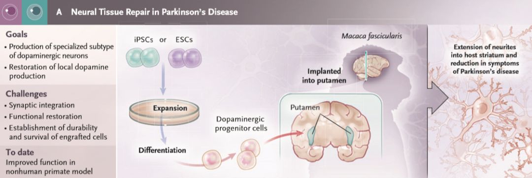经过数十年的研究与经验积累,我们发现利用多能干细胞衍生成的多巴胺能神经元可以治疗帕金森病。