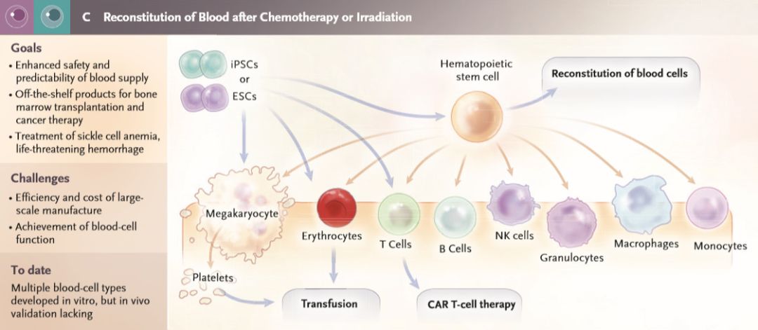 红细胞、血小板、T细胞以及造血干细胞已经成为从多能干细胞中衍生出的最受欢迎的细胞产物。红细胞和血小板可以解决患者输血时遇到的血液数量不够的问题。而由多能干细胞衍生出的T细胞则在肿瘤治疗领域发挥着重要的作用。