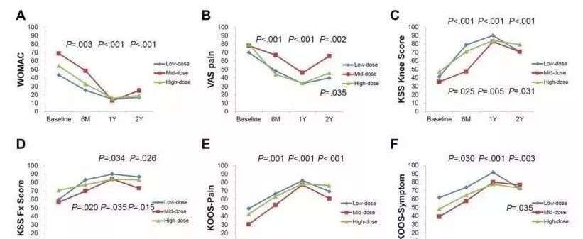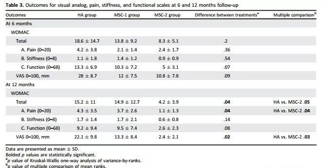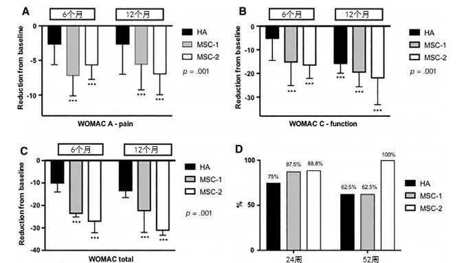 在12个月的随访期间,未发生严重不良事件。从结果来看,无论是单剂量还是双剂量治疗,MSCs治疗组都要优于HA对照组。