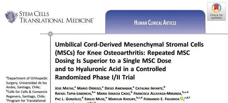 近日,智利的研究人员Francisco Espinoza等在《干细胞转化医学》上发表了一项UC-MSCs治疗膝关节炎 I/II 期随机对照临床试验(NCT02580695),临床试验结果显示,多剂量MSCs治疗效果优于单剂量或补充透明质酸(HA)。