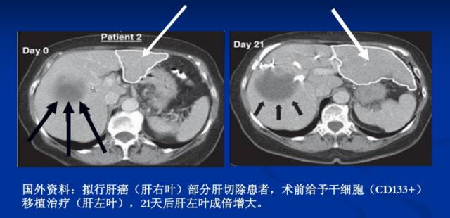 干细胞能迁徙并归巢到受损的肝组织,分化为肝样细胞,抑制肝细胞凋亡,刺激内源性肝细胞再生,促进造血生长因子、表皮生长因子和血管内皮生长因子分泌,从而增强肝脏再生。