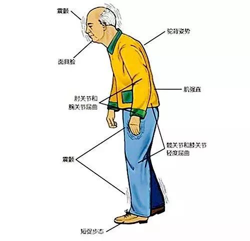 震颤、肌强直、动作迟缓、姿势平衡障碍。