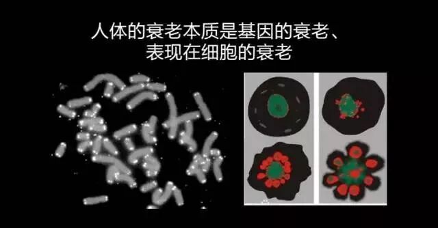 想让大家关注的是,在每条染色体的顶边,有一些亮点,这些亮点医学上称之为“端粒”。端粒的作用是什么?它是一个“帽子”,它把染色体给保护起来。如果这个“帽子”丢失了,那么染色体会不断地缩短。缩短的结果是你的基因不断丢失。