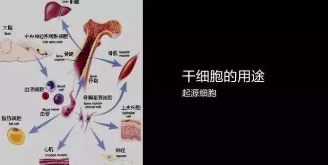 图上显示,它可以分化为成纤维细胞、血液细胞、上皮细胞、神经细胞、骨骼细胞等。最终分化成不同的组织,不同的器官。这是干细胞在体内就有的功能。
