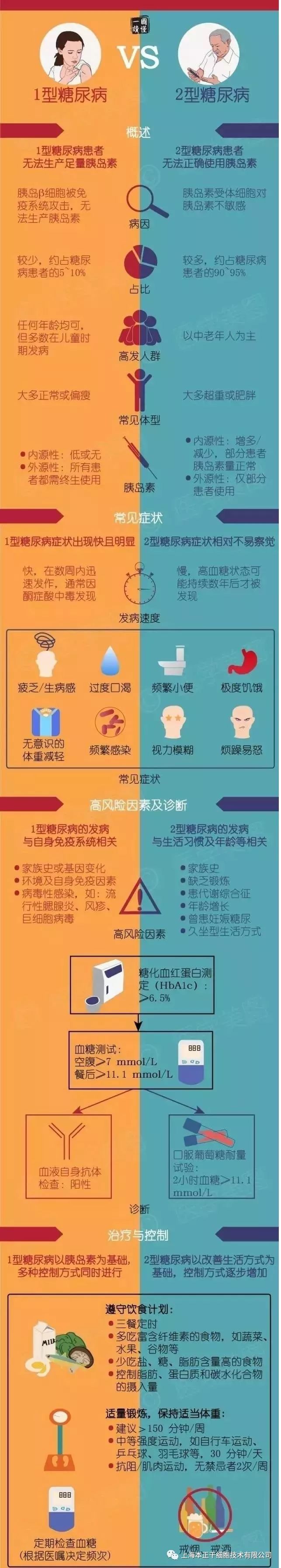 糖尿病已经慢慢成为最常见的一种慢性疾病,很多的人都是在不知不觉中被这种疾病盯上的。关于糖尿病的类型,目前还是有很多人存在误解,最常见的就是1型糖尿病和2型糖尿病的区别,今天就跟大家详细比较一下。