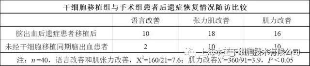 临床试验:对脑出血病程为1-3月的20例患者进行干细胞移植,术后2年随访,发现经干细胞移植的患者肌张力改善最为明显,肌张力均有所下降,语言表达能力有所改善,吐字清晰。干细胞对脑卒中患者的预后程度优于未经干细胞移植同期脑出血的患者。