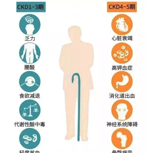 氮质血症期肾小球滤过率减少至25毫升/分钟,肾单位减少50%-70%,肾浓缩功能障碍,出现夜尿或多尿,不同程度的贫血,常有氮质血症,血肌酐、尿素氮增高。临床可有乏力、食欲减退、恶心及全身轻度不适等。此期如忽视肾功能保护或机体额外负荷,会出现严重呕吐、腹泻、致血容量不足,若有感染或使用使用肾毒性药物等,均可致肾功能迅速减退而衰竭。