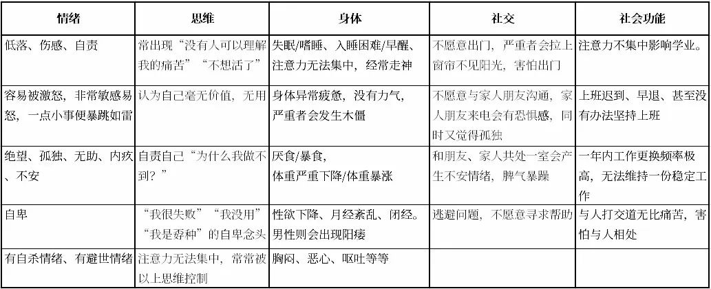 (如果你有下图中以下症状,并持续2周以上,请及时到正规三甲医院心理科进行心理评估就医!)