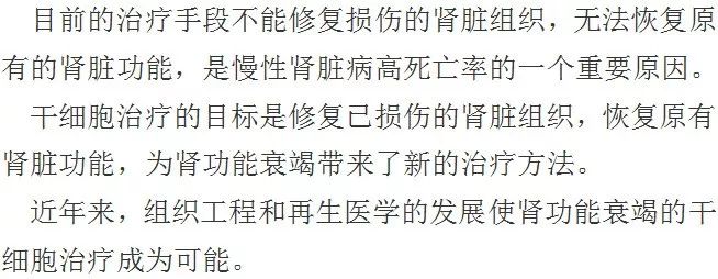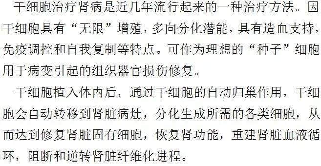 近年来基础研究干细胞治疗肾病过程中发现,干细胞可分化成肾固有细胞,肾实质细胞等,所以干细胞移植后对肾脏功能具有良好的修复和重建作用。