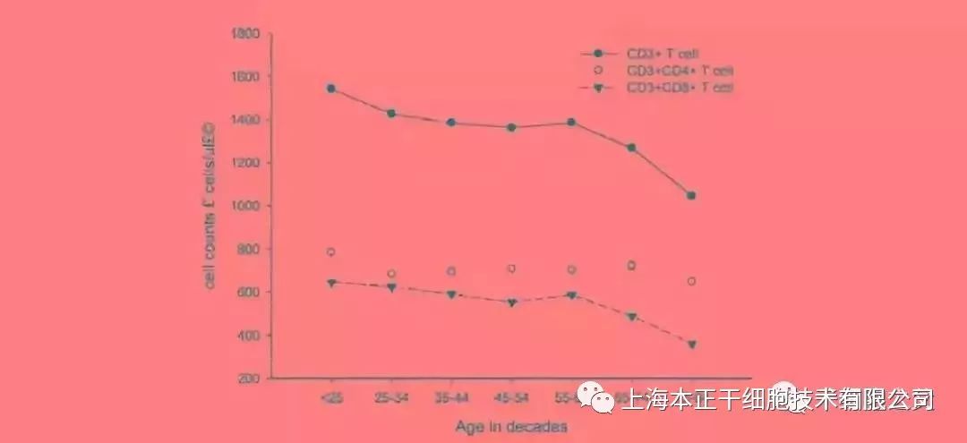 通过对不同年龄人群研究,发现免疫反应能力随年龄增长而降低。有两个明显降低的年龄点:25岁,相比25岁之前会有明显的下降,65岁,相比65岁之前又是一个显著的下降。 20岁左右的人与70岁的人体内T细胞数量一样,但在70岁的人体内,只有一成的T细胞能够正常运作。