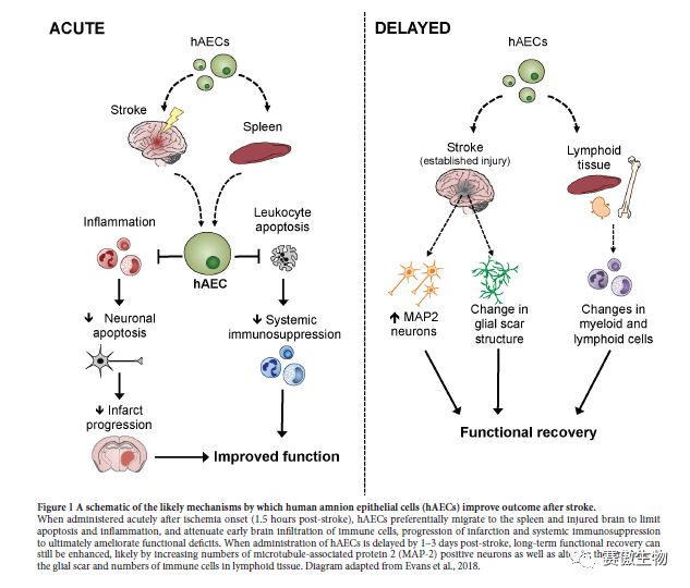 2018年,澳大利亚莫纳什大学的科研人员使用四种中风动物模型评估了静脉滴注脐带干细胞(hAESCs)对缺血性中风结果的影响,治疗证明中风后静脉注射hAESCs时,细胞优先迁移到脾脏以及损伤的脑部,以限制细胞凋亡和炎症,并减轻免疫细胞的早期脑浸润、梗塞的进展,并最终改善功能缺陷。