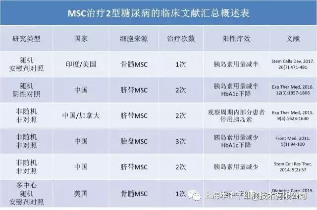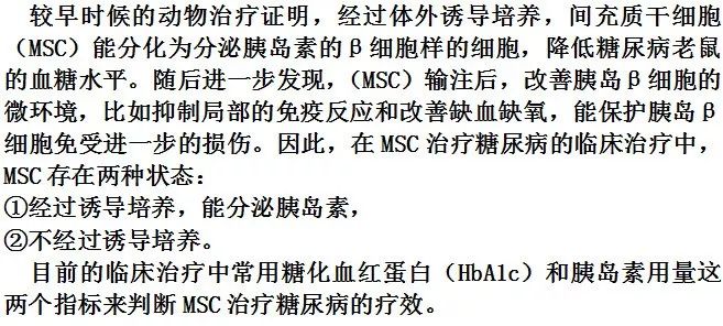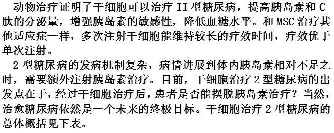 一个多中心随机安慰剂对照临床治疗,不伴随并发症的2型糖尿病患者,口服降糖药不能稳定血糖,而且使用胰岛素不超过7天;患者单次静脉注射干细胞,根据干细胞的细胞数不同分为3组,每组均为15例患者,0.3 x 106/kg组、1.0 x 106/kg组、2.0 x 106/kg组;12周内,2.0 x 106/kg组的患者糖化血红蛋白(HbA1c)下降明显,但是其他观察指标没有明显的改变。这是一个高质量的临床治疗,但是从结果来看,即使给与高剂量MSC(2.0 x 106/kg)治疗,单次注射不能让2型糖尿病患者明显收益。