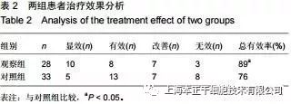 两组患者治疗效果比较,观察组治愈10例,对照组治愈5例,观察组和对照组的总有效率分别为89%和76%,经比较差异有显著性意义(P<0.05),见表