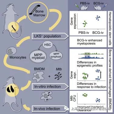 然而,导致TB的结核分枝杆菌(Mycobacterium tuberculosis,Mtb)也能解除巨噬细胞的杀伤程序,并将它们变成一种“避难所”,用于复制和生长。Divangahi博士的团队调查了这一过程,以期找到促进巨噬细胞TB杀伤效率的方法。 治疗中,科学家们给小鼠接种了免疫细胞疫苗。在一系列治疗中,他们观察到,在骨髓中,免疫细胞能够重编程或“杀死”结核分枝杆菌和TB耐药菌株 接着,专家们想要弄清楚“诱导干细胞产生免疫力”这种保护途径背后的分子机制。他们分析了参与触发对抗TB的增强型先天免疫反应的基因通路,最终,展示了保护程序(protective programs)是如何从干细胞一路“传递”到巨噬细胞中的,并鉴定出了巨噬细胞中保护性通路的遗传印记。