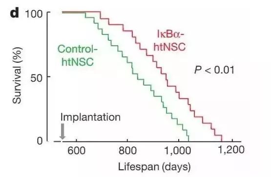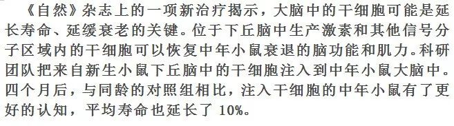 ▲ 在下丘脑内植入特殊的神经干细胞后(红色),小鼠的寿命得到了延长。