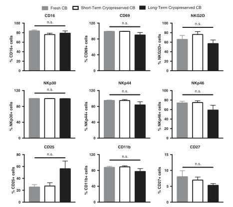三种脐带血来源NK细胞的激活和成熟标记物表达相似