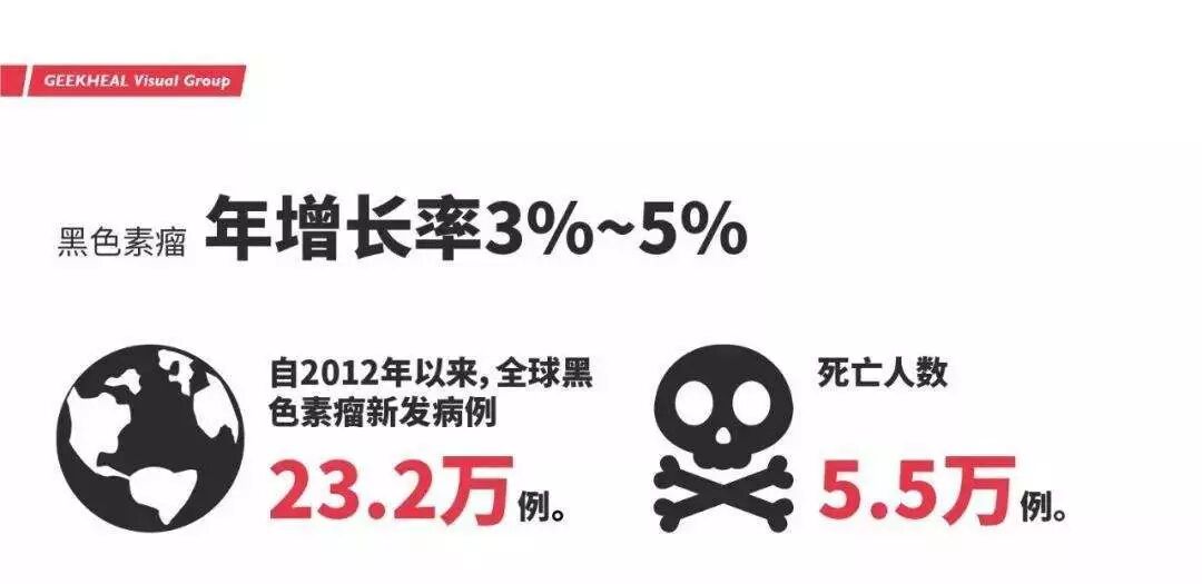 目前,黑色素瘤凭借3%-5%的年增长率,已成为所有恶性肿瘤中发病率增长最快的一种。据统计,2012年全球黑色素瘤新发病例23.2万例,死亡人数为5.5万例。