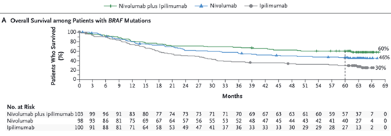 数据还统计了针对黑色素瘤中发生基因突变的患者(约占患者的66%)进行的免疫治疗,总体5年生存率竟高于未基因突变的患者8%,达到60%!