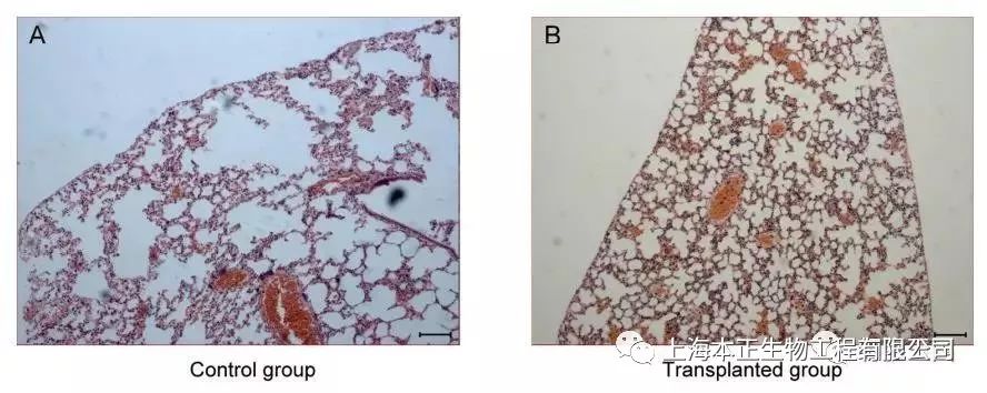 未移植干细胞的对照组肺气肿改变明显:气腔扩大,正常肺泡结构破坏