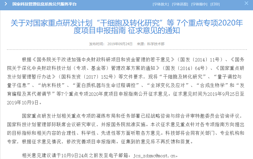 干细胞及其转化应用治疗是近些年发展迅速和广受关注的领域,是生命科学与生物技术治疗的前沿和制高点。 自从美国《科学》杂志将“干细胞治疗”评为当年世界十大科学成就之首以来,干细胞治疗成果数次入选当年度世界十大科技成就之列。与此同时,干细胞转化及产业化进程也快速发展,将带来全球范围内人口健康与医药领域革命性前进。 近年来我国政府对干细胞与再生医学也给予了大力支持,国家级各部委颁布了多项支持政策。全国各省市也做出积极响应,陆续推出多项政策,北京、上海、广州、深圳、雄安(河北)等地先后发布政策,加速推动干细胞技术和产业化的发展。 2019年,国家层面以及地方层面均发布利好政策,行业进入快速发展期。 【国家21部委联合发文:加快干细胞与再生医学、肿瘤免疫治疗、新一代基因测序等关键技术治疗和转化!】 2019年8月,国家发改委官网发布了《促进健康产业高质量发展行动纲要(2019-2022年)》。文件中明确:到2022年,基本形成内涵丰富、结构合理的健康产业体系,优质医疗健康资源覆盖范围进一步扩大,健康产业融合度和协同性进一步增强,健康产业科技竞争力进一步提升,人才数量和质量达到更高水平,形成若干有较强影响力的健康产业集群,为健康产业成为重要的国民经济支柱性产业奠定坚实基础。 同时,文件中提出:支持前沿技术和产品治疗应用。发挥部门合力,增强科研立项、临床治疗、准入、监管等政策的连续性和协同性,加快新一代基因测序、肿瘤免疫治疗、干细胞与再生医学、生物医学大数据分析等关键技术治疗和转化,推动重大疾病的早期筛查、个体化治疗等精准化应用解决方案和决策支持系统应用。 【2020年“干细胞及转化治疗”国家重点研发计划项目申报指南(征求意见稿)发布!】 2019年9月,科技部官网发布了《“干细胞及转化治疗”试点专项2020年度项目申报指南(征求意见稿)》,意见稿中明确:国拨总经费2.3亿元(其中,拟支持青年科学家项目6个,国拨总经费不超过 3600万元)。 【打造细胞治疗示范区!天津印发《滨海新区细胞产业技术创新行动方案》】 2019年10月,天津市滨海新区人民政府正式印发《滨海新区细胞产业技术创新行动方案》,目标将滨海新区建成细胞治疗示范区。建成以细胞和基因治疗为代表的生物医学新技术临床治疗与应用基地,打造辐射全国的健康医疗示范区。 另外,还将滨海新区打造成政策创新先行区。创新政策监管体制,探索细胞治疗分级分类管理,推动细胞产业安全、规范、高质量发展。 【雄安自贸区:鼓励企业进行免疫细胞治疗等新技术治疗,允许企业依法依规开展新型生物治疗业务!】 2019年10月,河北省人民政府官网正式发布了《中国(河北)自由贸易试验区管理办法》。办法中明确:在产业开放方面,自贸试验区加强生物医药研发创新力度。支持自贸试验区内符合条件的医疗卫生机构开展干细胞临床前沿医疗技术治疗项目,建立项目备案绿色通道。在雄安片区推进生命科学与生物技术创新发展。鼓励企业进行免疫细胞治疗、单抗药物、基因治疗、组织工程等新技术治疗,允许企业依法依规开展新型生物治疗业务。建立人类遗传资源临床治疗备案制度。支持雄安片区建设基因数据中心。 【我国首个《先行区干细胞医疗技术准入与临床治疗及转化应用管理办法(试行)》将发布】 2019年7月,海南省卫健委官网发布了《海南省卫生健康委员会 对政协海南省第七届委员会第二次会议 第0391号提案的答复(复文分类:B)》,答复中明确:在前沿医疗技术治疗方面,为规范和促进先行区生物医学前沿技术临床治疗与转化应用,省卫生健康委起草了《先行区干细胞医疗技术准入与临床治疗及转化应用管理办法(试行)》,将于近期正式印发。 据《海南日报》报道,海南省制定了《博鳌乐城先行区干细胞医疗技术准入和临床治疗及转化应用管理办法》和《海南省创制新药成果转移转化基地建设项目申报书》,探索干细胞和新药转化在博鳌乐城国际医疗旅游先行试验区先行先试。 目前,国家已将该支持政策扩展为全国所有自贸区均可开展干细胞临床前沿医疗技术治疗项目。为了推动自贸试验区建设再上新台阶,国务院曾印发《关于支持自由贸易试验区深化改革创新若干措施的通知》。措施中明确:自贸试验区内医疗机构可根据自身的技术能力,按照有关规定开展干细胞临床前沿医疗技术治疗项目(负责部门:卫生健康委)。 【深圳市人民政府关于支持自由贸易试验区深化改革创新若干措施工作方案的通知】 深圳市新颁布的自贸区改革创新措施的工作方案,包含了一条重要的干细胞相关政策: “自贸试验区内医疗机构可根据自身的技术能力,按照有关规定开展干细胞临床前沿医疗技术治疗项目。” 【上海市:《本市贯彻〈关于支持自由贸易试验区深化改革创新若干措施〉实施方案》】 上海市人民政府正式发布了《本市贯彻〈关于支持自由贸易试验区深化改革创新若干措施〉实施方案》的通知,通知中针对干细胞技术及产业发展推出三条全新政策。 (一)浦东新区医疗机构可根据自身的技术能力,按照有关规定开展干细胞临床前沿医疗技术治疗项目。(责任部门、单位:市卫生健康委、市药品监管局、市市场监管局、上海海关、市科委、浦东新区) (二)支持在上海自贸试验区建设干