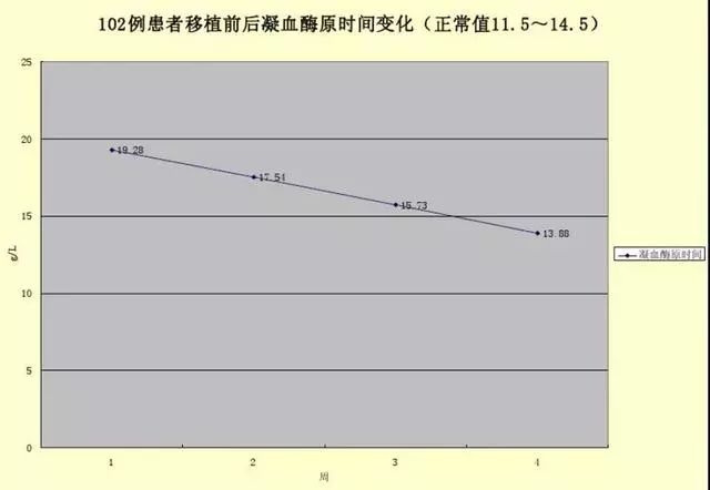 干细胞移植后,PT明显下降,第四周统计结果显示P<0.05,有明显意义。