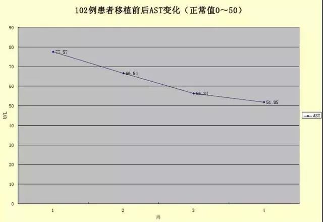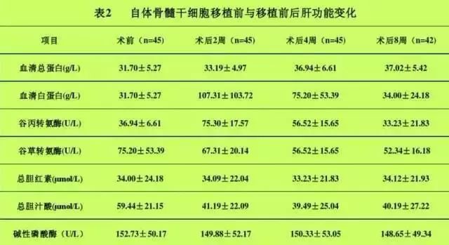 移植前后对比,血清白蛋白变化最为明显,于第1周即可见升高,第4周明显升高,统计学P<0.01,代表干细胞移植治疗肝病有明确意义。