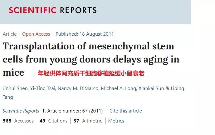 2011年8月,一篇名为《间充质干细胞移植延续小鼠衰老》的文章刊登在杂志《SCIENCE REPORTS》。
