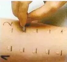 点刺检验是将少量高度纯化的致敏原液体滴于患者前臂、再用点刺针轻轻刺入皮肤表层。点刺液仅为皮内检验的万分之一,皮损小,安全性较高,患者几乎无痛苦。食物性过敏原和吸入性过敏原均在15分钟后出结果。