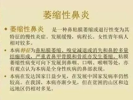 表现为鼻腔粘膜,粘膜下和下鼻甲的萎缩性改变,患者存在不同程度的吸气时,鼻痛,头痛,鼻,咽干燥,鼻腔结痂等症状,严重影响生活质量。
