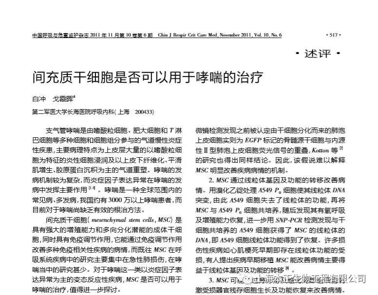 2011年,我国《中国呼吸与危重监护杂志》刊登了“间充质干细胞是否可以用于哮喘的治疗”这个主题。通过对间充质干细胞作用机制的可能性、与呼吸系统多种疾病相关借鉴性、现有的间充质干细胞治疗哮喘印证性多个方面探讨,明确认为间充质干细胞能有效抑制急性哮喘及慢性哮喘模型气道炎症,降低哮喘气道反应性,抑制气道重塑。
