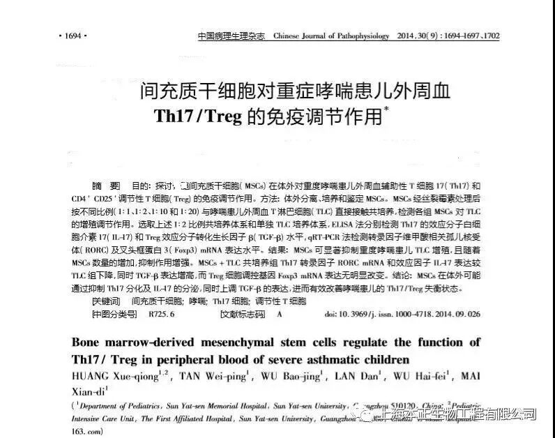 2014年,在《中国病理生理杂志》上发表了一篇文章,探讨了间充质干细胞对重症哮喘患儿外周血Th17/Treg的免疫调节作用。
