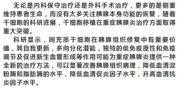 总之,越早使用干细胞治疗效果越好。早期治疗可以有效抑制炎症引起的多器官损伤,胰腺炎是一种炎症性疾病,炎症反应是重症胰腺炎早期重要的病理变化,过度的炎症反应引起的炎症反应综合征是导致器官损伤,甚至早期死亡的主要原因。所以,尽早使用干细胞治疗可以有效的阻止胰腺炎的病程进展,更早的恢复身体健康。