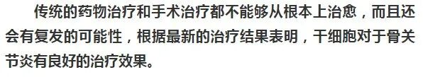 干细胞治疗关节炎是目前治疗方法上最持续有效和最彻底的方法,可改善患者体内的治疗环境、调节免疫功能,激活受损及休眠的细胞。