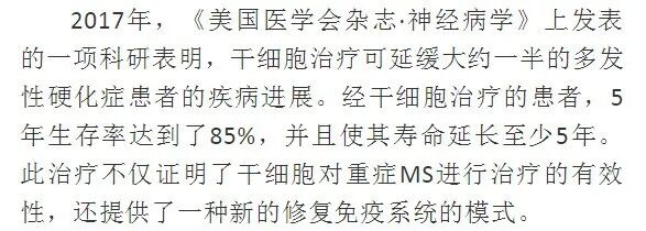 上海本正干细胞实验室对6MS患者进行了间充质干细胞治疗,并进行了2年的随访追踪,显示出患者的神经功能得到改善,视觉障碍,手臂、腿或脸部麻木刺痛,疲劳、肌肉无力和痉挛等明显好转。表面间充质干细胞治疗MS是可行和有效的。