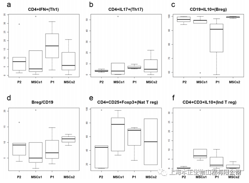 间充质干细胞对血液中T细胞和B细胞的影响。治疗结果显示间充质干细胞的治疗后调节性B细胞(B reg)亚群增加。