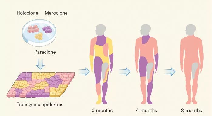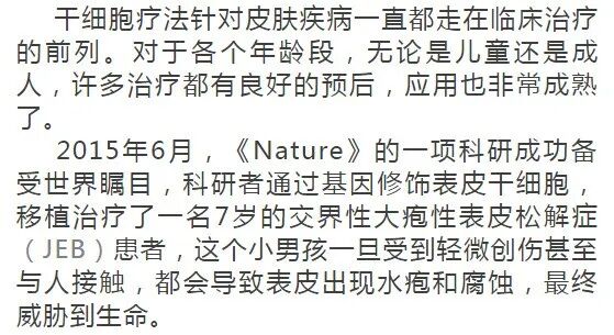 入院前,他全身已经有80%皮肤损伤丢失。通过基因修饰结合干细胞移植,8个月后,这位儿童重获健康皮肤病出院,至今仍然正常。这表明干细胞疗法有潜力再生了整个人类表皮,也让各种难治性复发性皮肤疾病都看到了治愈的希望。