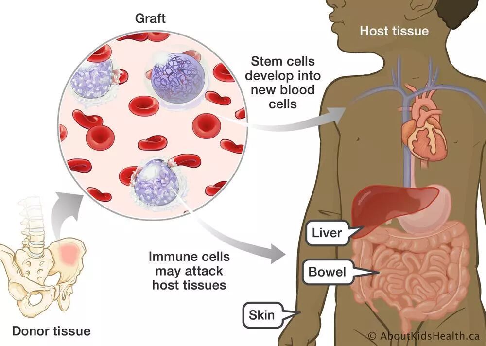 自20世纪90年代造血干细胞移植疗法进展迅猛,渐渐成为治愈多种血液病与遗传性疾病的重要手段。当孩子进行同种异体血液和骨髓移植(BMT)后,有一种并发症也随之而来——移植物抗宿主病(graft-versus-host disease,GVHD),其原理是当来自供体的免疫系统细胞增殖并攻击宿主的组织时,这种病便会出现。它会使身体内的多系统遭到损害(皮肤、食管、胃肠,肝脏等全身性系统),是造成死亡的重要原因之一。