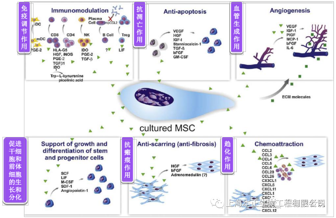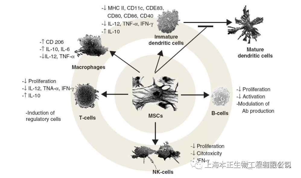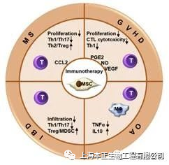 具体的讲:间充质干细胞的免疫调节作用,包括对CD8+和CD4+ T细胞和NK细胞增殖的抑制作用,通过抑制血浆细胞产生免疫球蛋白,对成熟的树突状细胞(DC)和抑制调节性T细胞增殖的刺激。这些正是PGE-2,HLA-G5、HGF、iNOS、IDO、TGF-β、IL-10、LIF的共同作用。同时CXCL12等趋化因子在词过程中对淋巴细胞和骨髓间充质干细胞起到了很强的趋化作用。