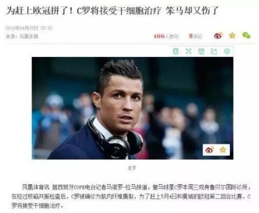 2016年4月,欧冠半决赛首回合皇马客战曼城,世界足球明星C罗伤势未愈,缺席比赛。据《阿斯报》报道:C罗在Ruber国际诊所接受非常规的医疗服务,MRI扫描结果显示,C罗的肌肉纤维损伤。为了加速复出,C罗将接受干细胞疗法,这种疗法,能加速受损细胞的再生长。