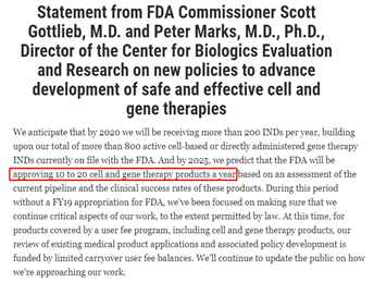 2019年年初,美国FDA宣布了对未来细胞治疗的发展计划,FDA预测到2025年这一领域每年将有10-20款新药获得批准。