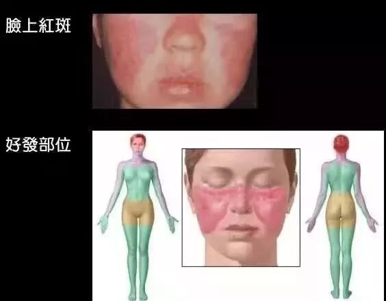 系统性红斑狼疮病人的两侧面颊有水肿性红斑,鼻梁上的红斑常与两侧面颊红斑相连,形成蝴蝶状的皮疹。这不仅代表了病人的内部器官、健康已经受到了很大的损害,也影响了病人的外貌,影响病人的正常社交。