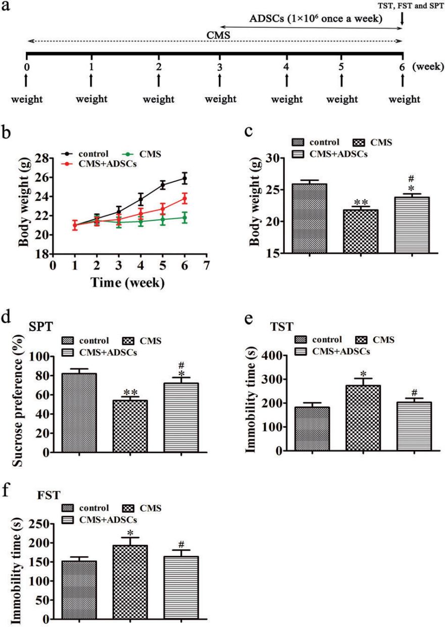 CMS科研设计如图1a所示:使用18只小鼠(对照组、CMS和CMS+MSC)。与对照组相比,CMS组小鼠的体重(BW)缓慢下降,MSC治疗恢复了CMS诱导的BW下降(图1b、1c)。CMS诱导小鼠出现明显的抑郁样行为,包括蔗糖偏好的降低(图1d)和TST(图1e)和FST(图1f)的静止性增加。MSC治疗能显著逆转CMS诱导的抑郁样行为,提示MSC治疗能改善CMS诱导的抑郁行为。