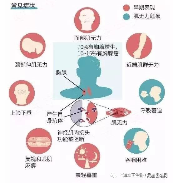 重症肌无力(myastheniagravis,MG)的发病原因分两大类,一类是先天遗传性,极少见,与自身免疫无关;第二类是自身免疫性疾病,最常见。重症肌无力是神经肌肉接头处因自身抗体破坏突触后膜导致神经肌肉接头传递障碍的疾病。科研普遍认为它是依赖于T细胞,由B细胞介导的发生在肌肉接头处。临床表现为骨骼波动性无力、不耐疲劳,活动后加重,休息后减轻。症状多分布于眼部、四肢肌肉,严重者累及呼吸肌造成呼吸衰竭(肌无力危象)。