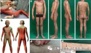c,男孩的转基因皮肤。图d,取活检的伤口正常愈合,没有像过去那样起一个大水疱。图e,即使揪起皮肤也不再担心弄伤男孩。