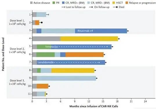 在参与这项临床治疗的11名患者中,8人(73%)对CAR-NK治疗有反应,其中7人完全缓解,没有出现副作用。并且在所有剂量水平滴注3天内可见,注入的CAR-NK细胞扩增并以低水平持续至少12个月。