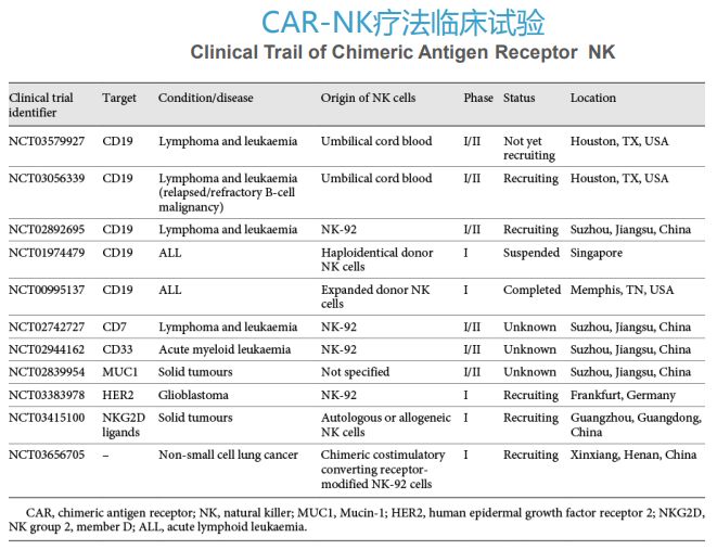 2020年2月,科学家在NEJM期刊上发表了靶向CD19的同种异体CAR-NK细胞疗法临床科研结果:在接受治疗的复发性/难治性CD19阳性肿瘤(非霍奇金淋巴瘤或慢性淋巴细胞白血病)患者中大多数对CAR-NK细胞有反应,没有副作用出现。